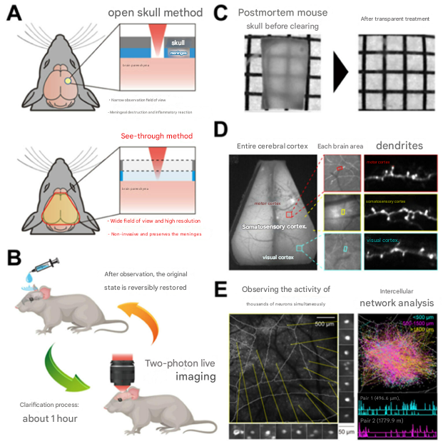 Conventional brain imaging techniques typically require skull thinning or complete removal, as seen in the thin-skull and open-skull methods. However, these approaches are invasive, may trigger inflammatory responses, and often limit the field of view. In contrast, the “SeeThrough” technique offers a novel, minimally invasive, and high-precision alternative that enables brain observation without bone removal.
