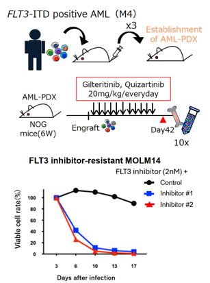 - PDX mouse models were created by transplanting bone marrow cells collected from FLT3 gene mutation-positive AML patients. We identified a group of molecules that were more highly expressed in leukemia cells remaining after long-term daily administration of FLT3 inhibitors (resistance-acquired) than before administration (top figure).