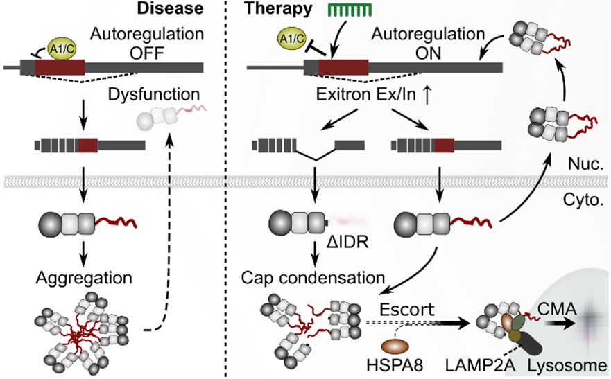 Layer 2: Induction of the ΔIDR Isoform (Caps aggregation and escorts it for degradation via Chaperone-Mediated Autophagy (CMA) mediated by HSPA8–LAMP2A)