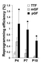 - When comparing reprogramming efficiency of tail-tip fibroblasts (TTFs), mandibular gingival fibroblasts (mGFs), and palatal gingival fibroblasts (pGFs) at the same passage number, GFs showed more than seven-fold higher efficiency. In particular, pGFs maintained high reprogramming efficiency through passage 10 (P10) (see figure on the right).