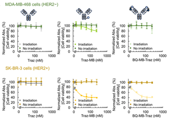 - BQ-MB-Traz demonstrated the same cytotoxic effect as MB-Traz in HER2-positive cells (fig. bottom: center and right). Meanwhile, while MB-Traz exhibited non-specific toxicity against HER2-negative cells, BQ-MB-Traz maintained high selectivity (fig. top: center and right).