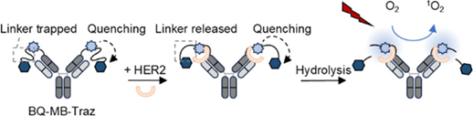 This technology fixes a photosensitizer and quencher connected by a linker to the N-terminus of the antigen-binding site. The linker is exposed only upon binding to the antigen, allowing the quencher to be cleaved by hydrolysis. Drugs in the blood and drugs nonspecifically bound to the Fc region are not activated, fundamentally suppressing phototoxicity (fig.).