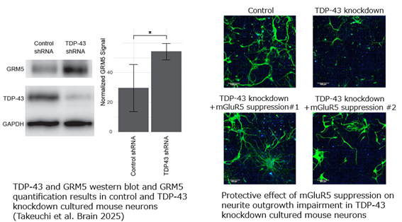 Through deep profiling of ALS patient tissues exhibiting TDP-43 pathology, mGluR5 was found to be markedly upregulated. Neuronal models with reduced TDP-43 expression exhibited severe neurite shortening, which was rescued by mGluR5 inhibition, confirming a neuroprotective role. Because mGluR5 is mainly expressed in the central nervous system, its inhibition is also expected to pose minimal systemic side effects—offering favorable clinical potential.