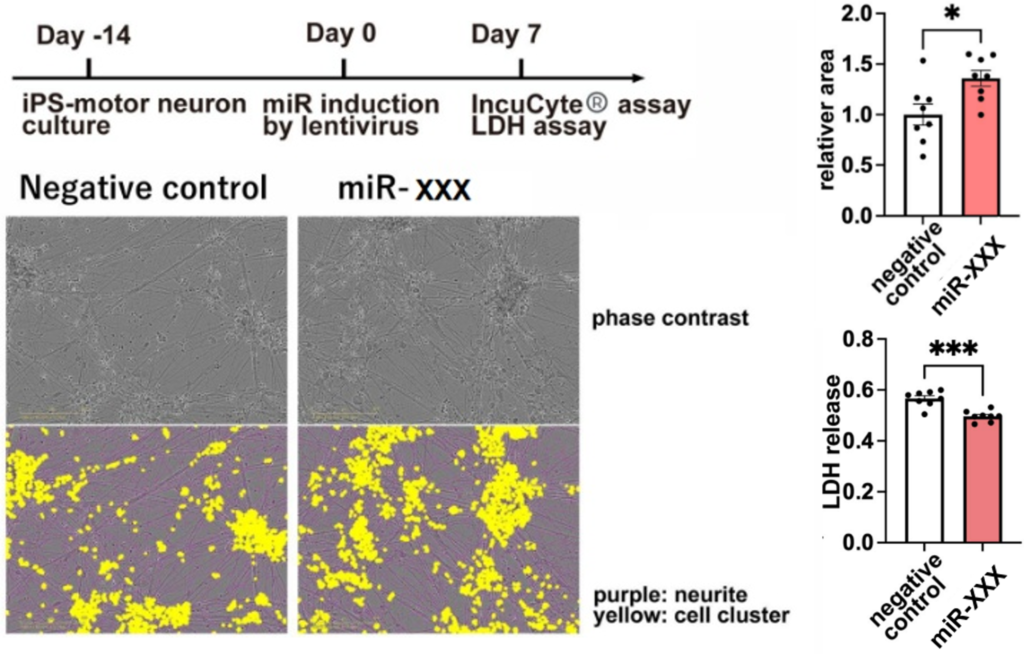 - When the miRNA was introduced into motor neuron cells derived from iPS cells of ALS patients using a lentivirus, the reduction in cell cluster area and cytotoxicity were suppressed.