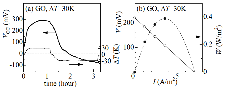 - When a 30K temperature difference was applied between the electrodes, the open-circuit voltage (Voc) increased to 292mV (left figure). The maximum output reached 0.40W/m^2 (right figure).