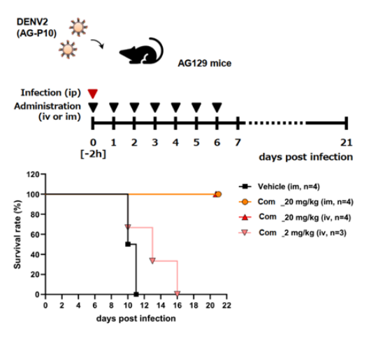 - The compound improved survival rate and inhibited viral replication in Dengue virus infection model mice and SARS-Cov2 infection model mice.