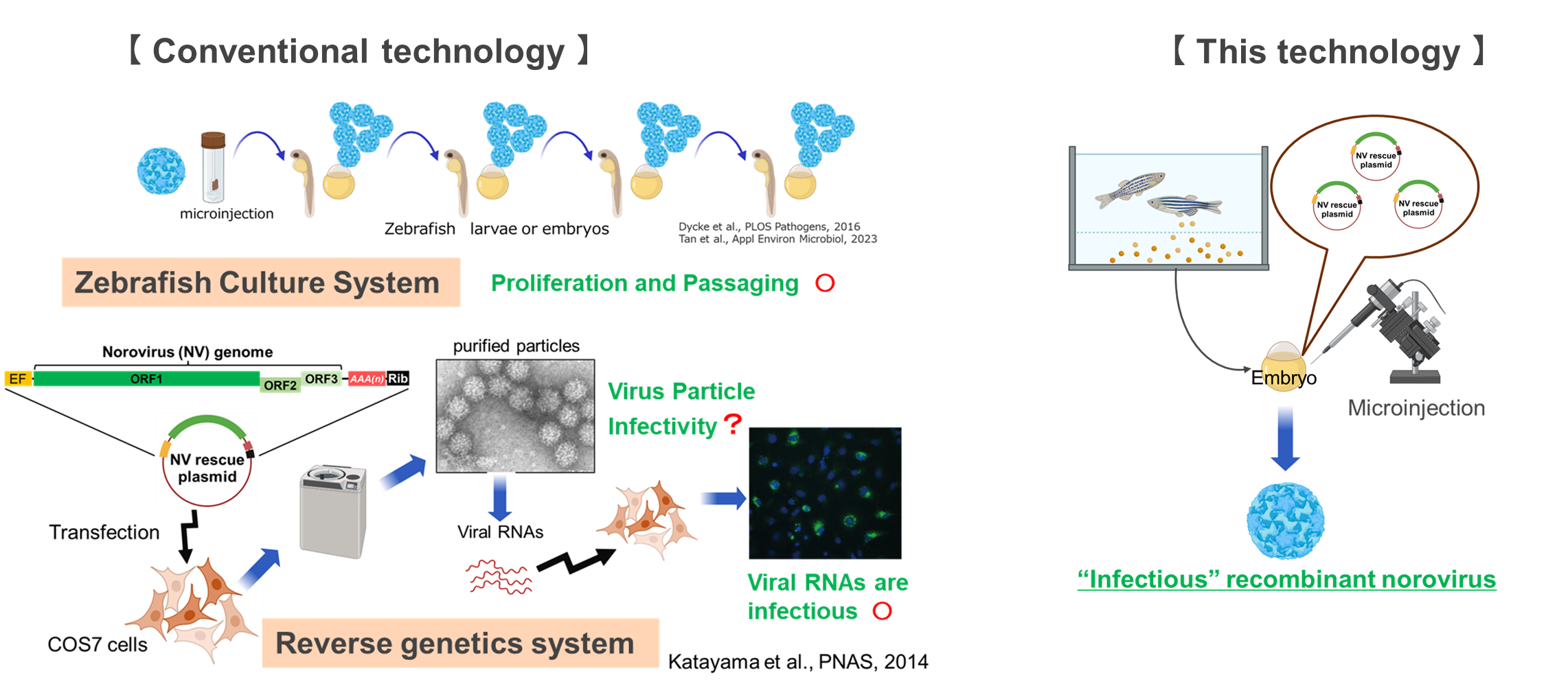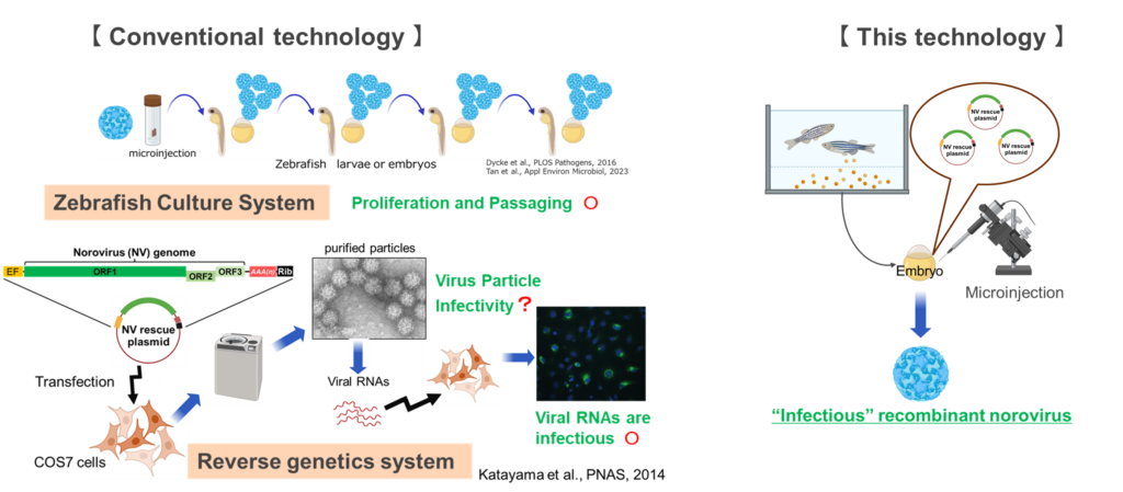 This technology combines the existing RG cell culture system with a zebrafish propagation system capable of serially culturing HuNoVs. By directly introducing a genomic cDNA plasmid into zebrafish embryos, the world’s first reverse genetics technology has been achieved. It is compatible with multiple genotypes, including GII.17 and GII.4, and allows for the introduction of specific nucleic acid site mutations and reporter genes while maintaining growth rates equivalent to those of the wild type. This enables a simple and stable supply of HuNoVs without relying on unstable natural strains or expensive organoid cultures, potentially fundamentally accelerating norovirus research and development, such as the selection of attenuated vaccine candidate strains and the establishment of antiviral drug evaluation systems.