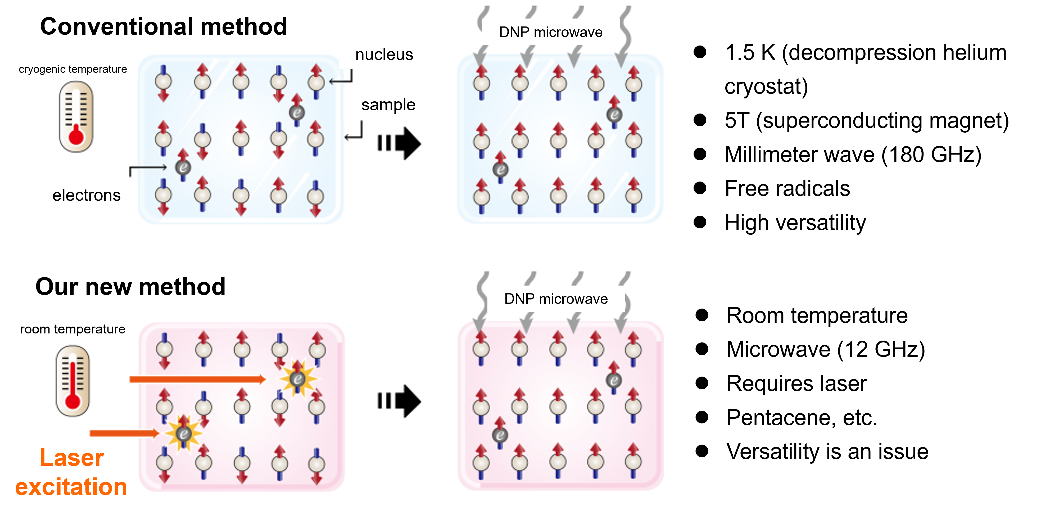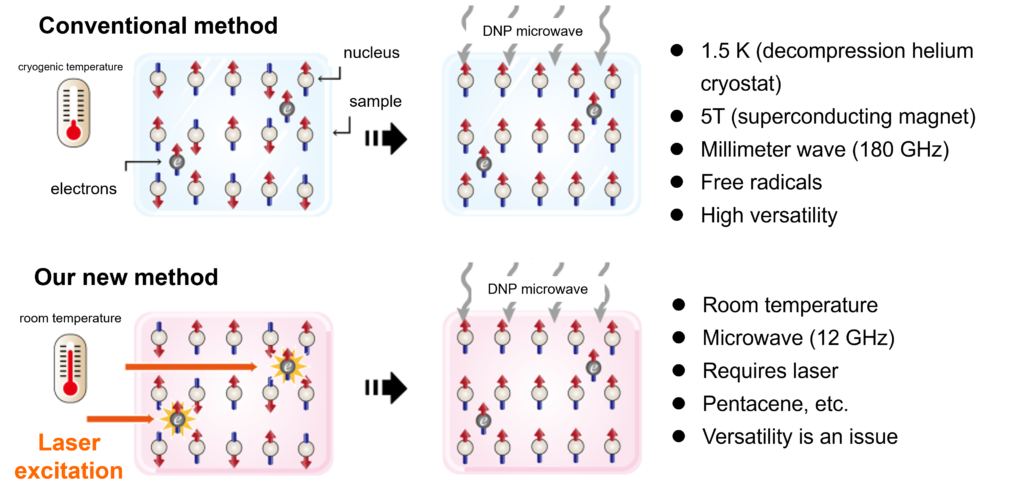 Professor Makoto Negoro and colleagues at the University of Osaka developed a new technique, the “Triplet DNP Method,” to overcome these challenges. This method uses laser-excited pentacene molecules in the triplet state as a polarization source. It combines microwave irradiation with magnetic field sweeping to polarize nuclear spins. This technology enables highly efficient polarization, resulting in signal intensities 10,000 times stronger than conventional NMR. Furthermore, it offers significant practical advantages: a long polarization lifetime (over 10 minutes), operation at room temperature, and low magnetic fields (0.4 T electromagnet).